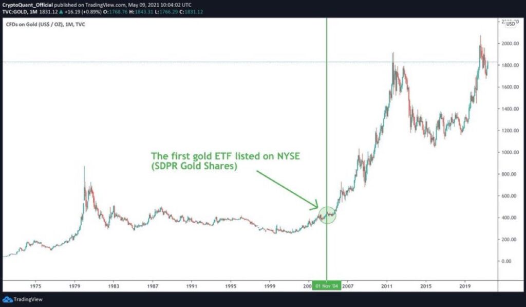 Od wielu lat Bitcoin posiada narracje cyfrowego złota, stąd często to aktywo porównywane jest do tego kruszcu. Jak widać podobne zdanie o BTC ma też Wall Street. Dlatego, gdy tylko został uruchomiony ETF na Bitcoina, to pojawiła się analogia z 2004 rokiem, kiedy to na rynku pojawił się ETF na złoto. Jak pokazuje poniższy wykres – złoto systematycznie szło do góry i nigdy nie wróciło do cen sprzed uruchomienia funduszu.