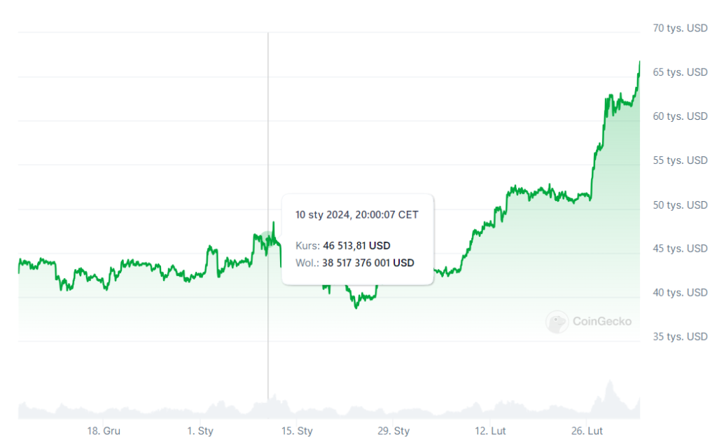 Bitcoin w dniu ogłoszenia decyzji o ETF kosztował 45-46 tysięcy USD (10 stycznia 2024). Później w ciągu kilku tygodni nastąpiło odreagowanie zgodnie z klasycznym zachowaniem inwestorów rozgrywających sell the news (kupuj plotki, sprzedawaj fakty). Po tym jednak Bitcoin zanotował rajd, co widać na wykresie: