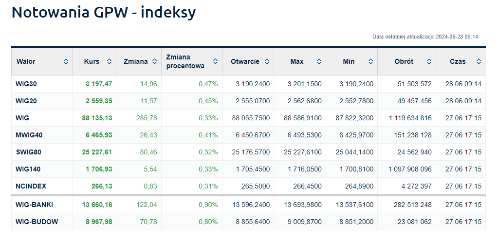 Najstarszy i najszerszy indeks giełdowy w Polsce, obejmujący wszystkie spółki notowane na rynku głównym GPW. Warszawski Indeks Giełdowy jest wskaźnikiem ogólnej kondycji rynku giełdowego w Polsce.