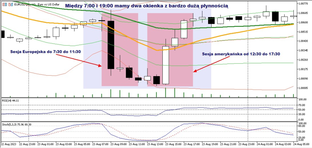 Źródło: platforma MT5, para walutowa EURUSD, H1. Dwa okna czasowe w ciągu dnia z największą płynnością i zmiennością na rynku.