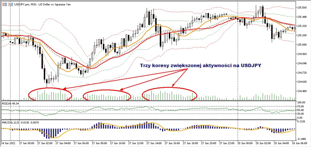 Źródło: platforma MT5, para walutowa USDJPY, M15. Trzy okna czasowe w ciągu doby z największą płynnością i zmiennością na rynku.