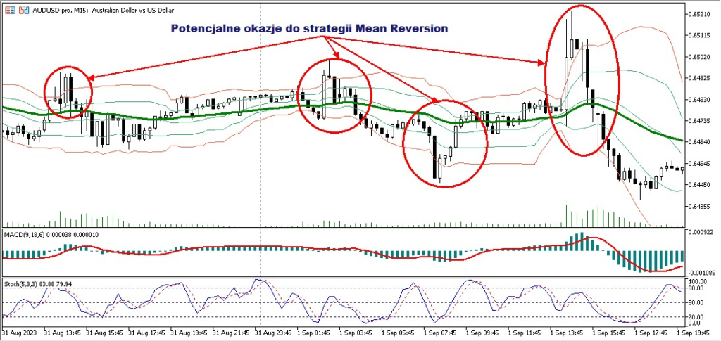 Źródło: platforma MT5, para walutowa AUDUSD, M15. Potencjalne okazje do strategii Mean Reversion.