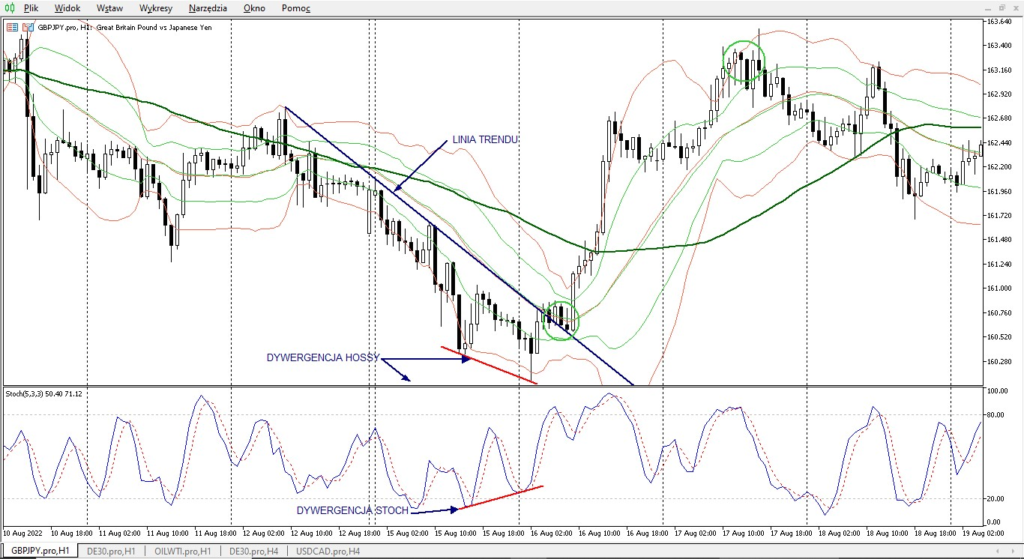 Źródło: platforma MT5, para walutowa GBPJPY, H1. Dywergencja Hossy, złamanie linii trendu, punkt wejścia i wyjścia. SO, BB, SMA, LTS.