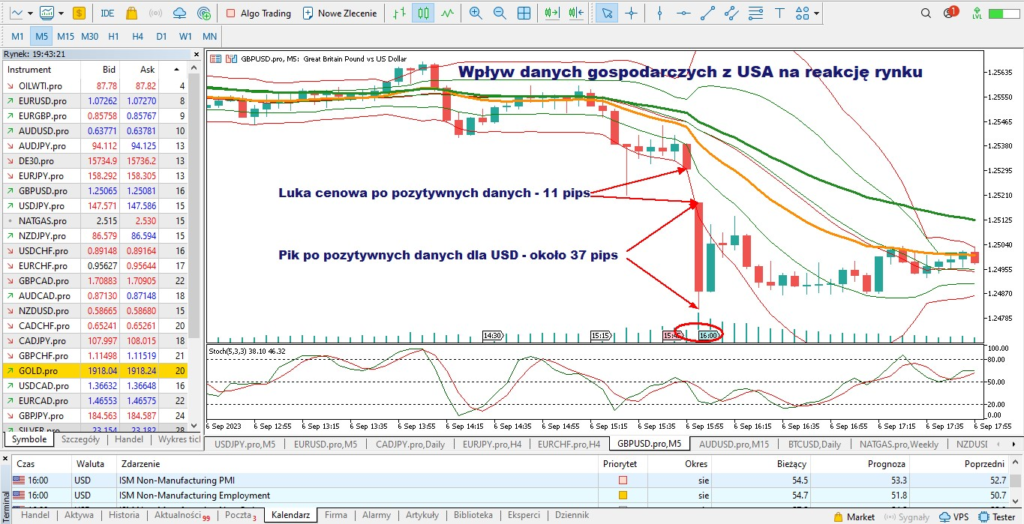 Źródło: platforma MT5, para walutowa GBPUSD, M5. Wpływ danych gospodarczych z USA na reakcję.rynku.