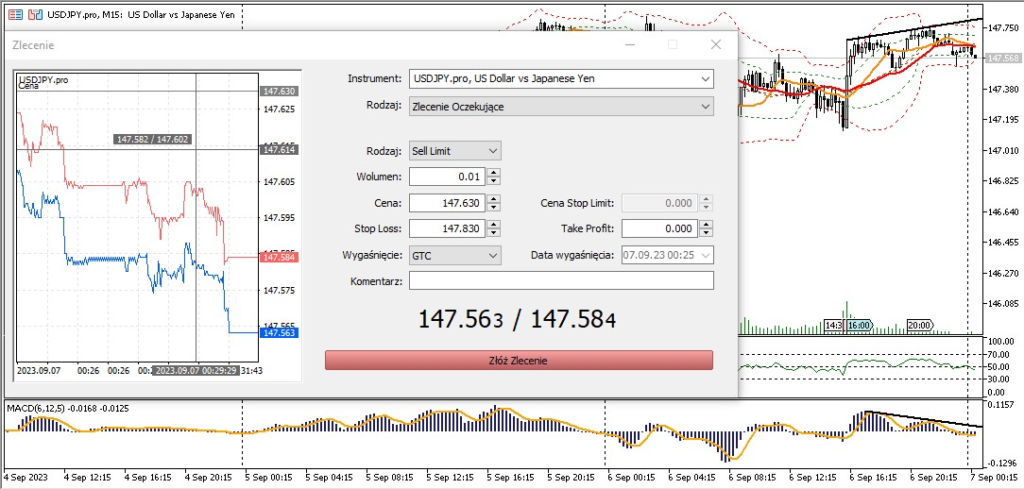 Źródło: platforma MT5, para walutowa USDJPY, M15. Zlecenie oczekujące Sell Limit na mikrolot. Dywergencja bessy. MACD, RSI, BB, SMA.