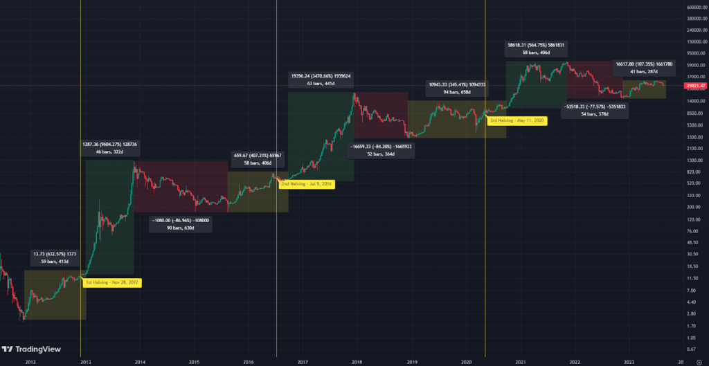Na poniższej grafice znajduje się wykres Bitcoina, a żółtą linią oznaczone są halvingi. Gołym okiem widać, że po zmniejszeniu nagrody dla górników cena systematycznie szła ku górze aż do wybicia nowego szczytu.